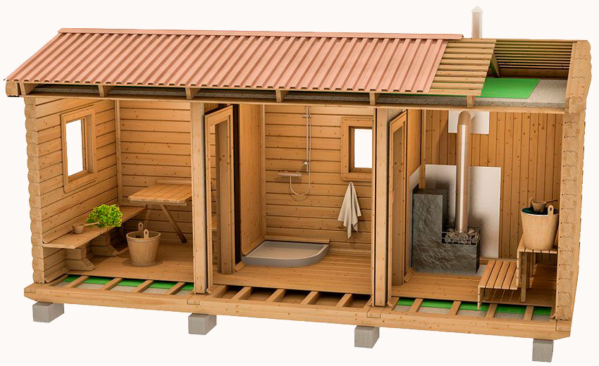Двухуровневые полки из осиновой шлифованной доски 25 мм., банная металлическая печка «Каменка 2» с встроенным баком для горячей воды на 50 литров, дымоход с искрогасителем и пожарной защитой, печные камни «Габбро-Диабаз» 2 коробки, отдушина для проветривания, слив воды по центру (в комплектациях, где парилка объединена с мойкой). В парном отделении под вагонкой по периметру прокладывается алюминиевая фольга.